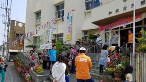 4月28日知花公民館前にて、子ども達が元気で健やかに育つことを祈願して多くのこいのぼりが、今年も掲げられました。数年前から宇良自治会長のアイデアで区内の保育園児(知花保育園・エンジェル保育園)たちの協力で鯉のぼりの塗り絵をしてもらい、GW期間中…