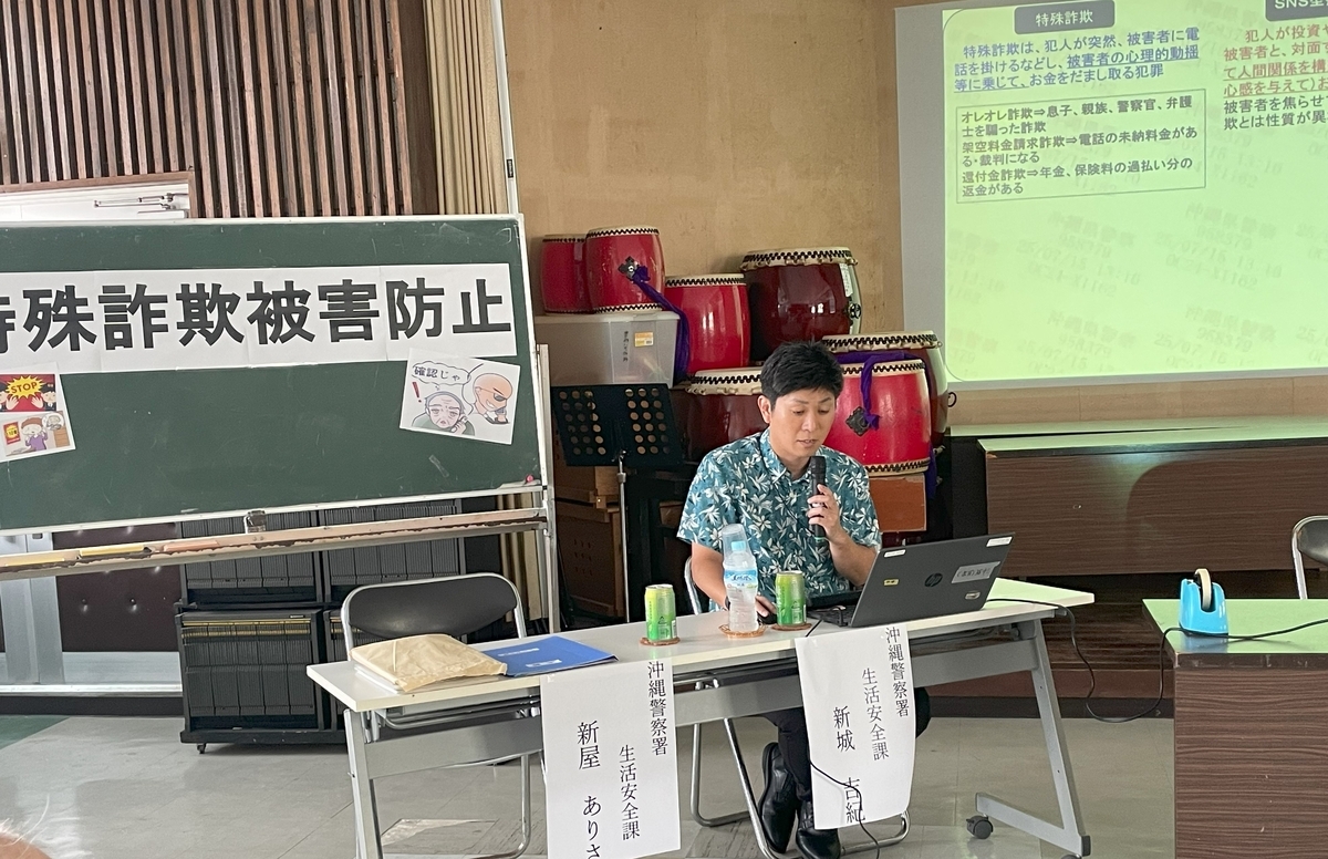 講師には沖縄警察署生活安全課係長新城吉紀、新屋ありさ両氏が行った。 県内外で急増している同事件の具体的な事例と特徴を解説し特にLINEのビデオ通話に誘導し警察のユニフォームを装い、警察手帳を見せながら背景で無線交信の音声を流すなど実に巧妙な劇場型の事例が増加しているという。